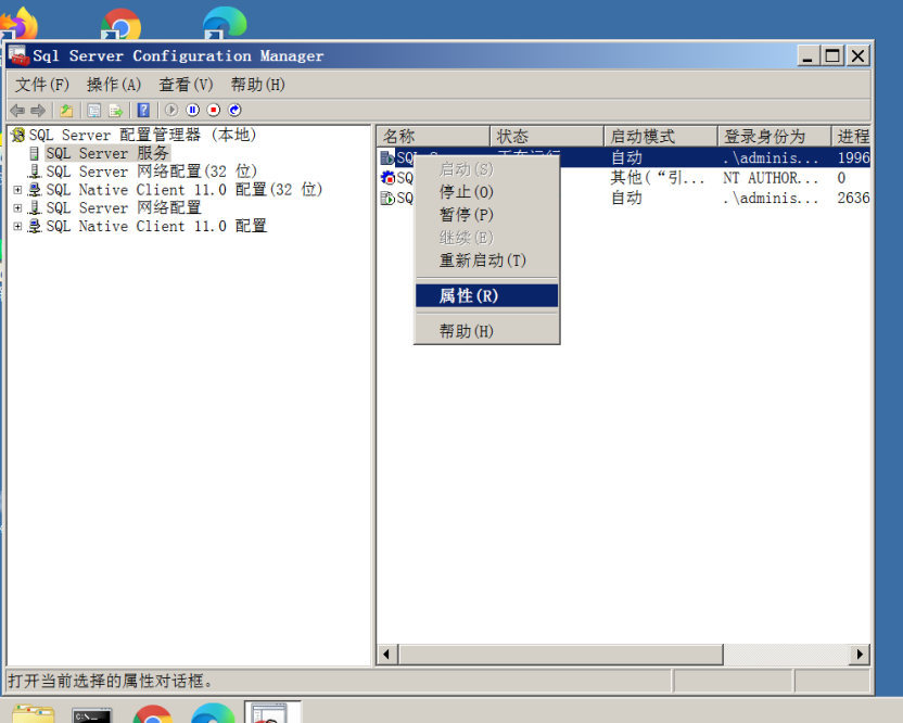 3. 在 SQL Server配置管理器中,找到已安装的 SQL Server 实例,右键该实例 –> 点击属性