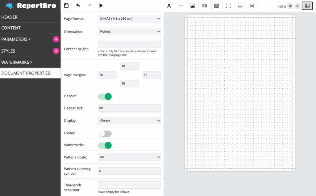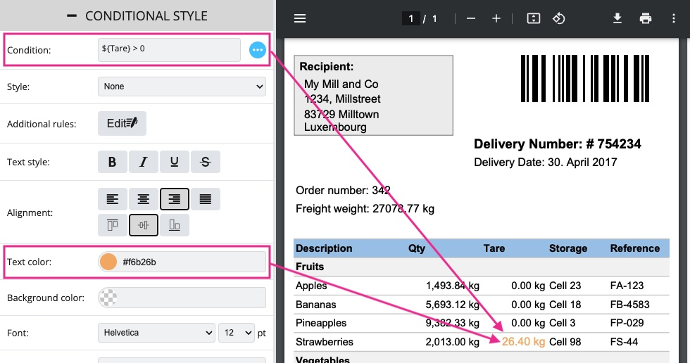 | 表格(Table) | 表格用于展示值的列表,例如 收据、统计报表和发货单项目。在表格中打印动态数据时,需要将数据源设置为 列表参数。 选择和导航 在表格上单击时,选中表格本身。 在表格中双击时,选中表格中的内容元素,可对内容元素进行详细配置。 配置和样式 配置表格内容元素的方式和配置文本元素的方式相同。 表格配置的等级 1. 表格元素: – 包含数据源的定义。 – 允许启用/禁用表头和表尾。 – 在进行分组展示时,设置内容行的数量(参考下一段:数据分组)。 – 在默认情况下,一个表格包含一个内容行用于遍历列表参数。 2. 表格内容元素: – 配置内容元素 – 在打印设置中,启用“总在相同页面展示”,可以在换页时阻止拆分行。 3. 表头和表尾元素(当启用时): – 当表格的数据超过多页时,表头可在每页上都展示。 更多:参考教程: 创建表格 数据分组 对于在表格内将数据行分组展示的需求,ReportBro添加了强大的层,用于组织数据。 1. 内容行的需求: – 为了创建分组表格至少需要定义2个内空行。 – 第一个内容行的作用是接受分组表达式 – 另外一个内容行的作用是保存实际的数据。 2.配置内容行: – 单击表格,并找到“内容行”配置项。 – 在菜单面板中,可以找到所有的内容行。 – 选择第一个内容行入口,并在打印配置中录入一个“分组表达式” – 此行只会在分组表达式的值变化的时候才打印。 3. 分组头和分组尾: – 对于每个分组,都可以对分组头和分组尾的显示进行配置。 – 为了在每个分组上都显示一个分组头, 需要确认包含“分组表达式”的内容行显示在包含实际数据的内容行上方(没有分组表达式的行) 更多:参考教程: 表格分组 隐藏表格列 通过控制表格列的显示条件,可以自定义表格列的展示。 1. 选择表格头列: – 单击需要控制显示的格式头列。 2. 定义打印条件: – 在打印设置中,设置一个显示条件,该列就会根据该条件进行展示或隐藏。 3. 调整空间: – 如果你希望在某列隐藏时,其他列可以占用该列的空间,可以每个列头上都定义增长权重。 – 如果未设置增长权重,该列的宽度会保持预设的值。 更多: 参考教程: 根据条件打印表格列 动态表格列 当你的数据没有固定的列时,你需要同时在横向和纵向扩展表格, 你可以通过使用“简单列表参数”灵活实现这个功能。 更多: 参考教程: 在表格中使用动态列 | ||